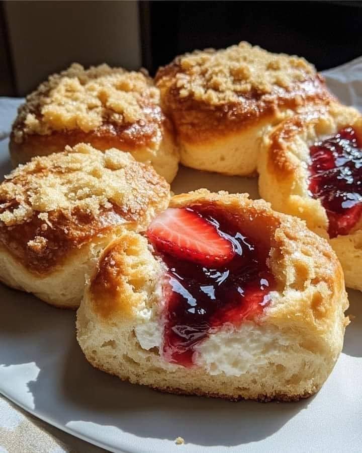 Miękkie, puszyste bułeczki mleczne z kremowym nadzieniem z sernika wiejskiego, dżemem truskawkowym i złotą kruszonką.