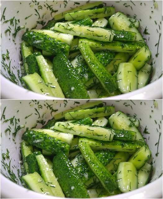 Drobno posiekaj koperek, pokrój czosnek w plasterki i dodaj do ogórków, dodaj sól. Wszystko dobrze wymieszaj i wstaw do lodówki na 30 minut, aby się zamarynowało.