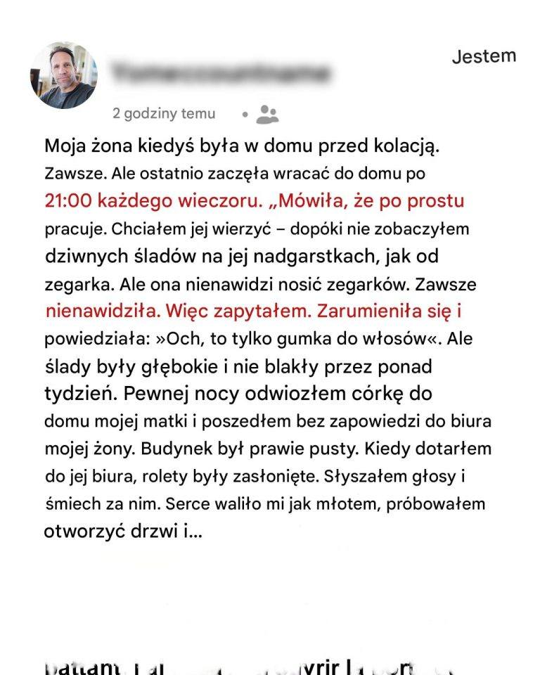„Jesteśmy w trakcie czegoś ważnego. Muszę zostać dłużej. To tylko praca” – odpowiedziała, kiedy zapytałem.
