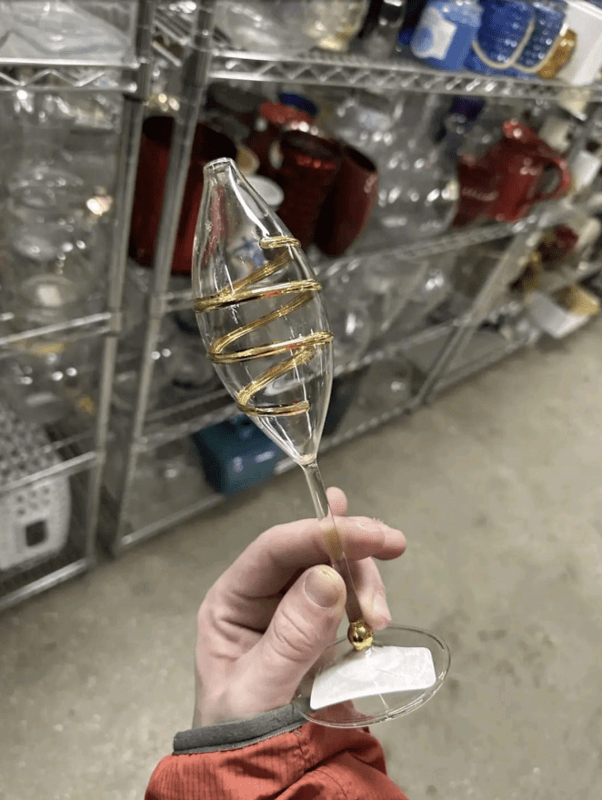 Nie spodziewałem się odkryć tego dnia kawałka przeszłości. Przyznam szczerze, że zabijałem czas w tym Goodwill, przeszukując zwyczajny cmentarz brudnych kubków, martwych, tajemniczych kabli i samotnej rolki, która zgubiła swoją jedyną towarzyszkę. Znasz tę scenę. Ale potem to zobaczyłem — to wysokie, delikatne szkło ze złotą spiralą owiniętą wokół brzucha. Wygląda na to, że przypomina delikatne, dmuchane szklane lampy naftowe z dawnych lat.