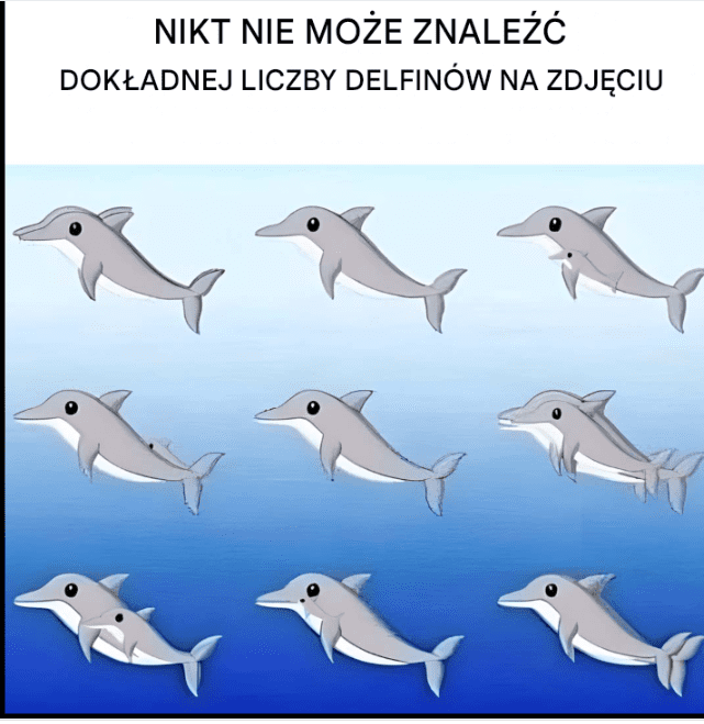 Zdjęcie pełne delfinów bawiących się w morzu… a może prawie. Ile z nich potrafisz dostrzec? Na pierwszy rzut oka wszystko wydaje się oczywiste, ale po bliższym przyjrzeniu się widać 17 delfinów, niektóre sprytnie zakamuflowane w sylwetkach innych.