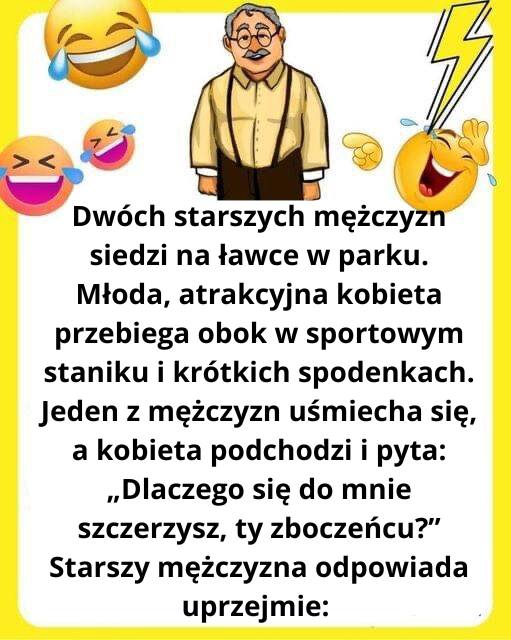 Starszy mężczyzna odpowiada uprzejmie: „Wcale nie uśmiecham się do ciebie. Uśmiecham się, bo bez względu na to, jak ciężkie jest życie, widok ładnych, młodych kobiet latem zawsze poprawia humor starszemu mężczyźnie”.