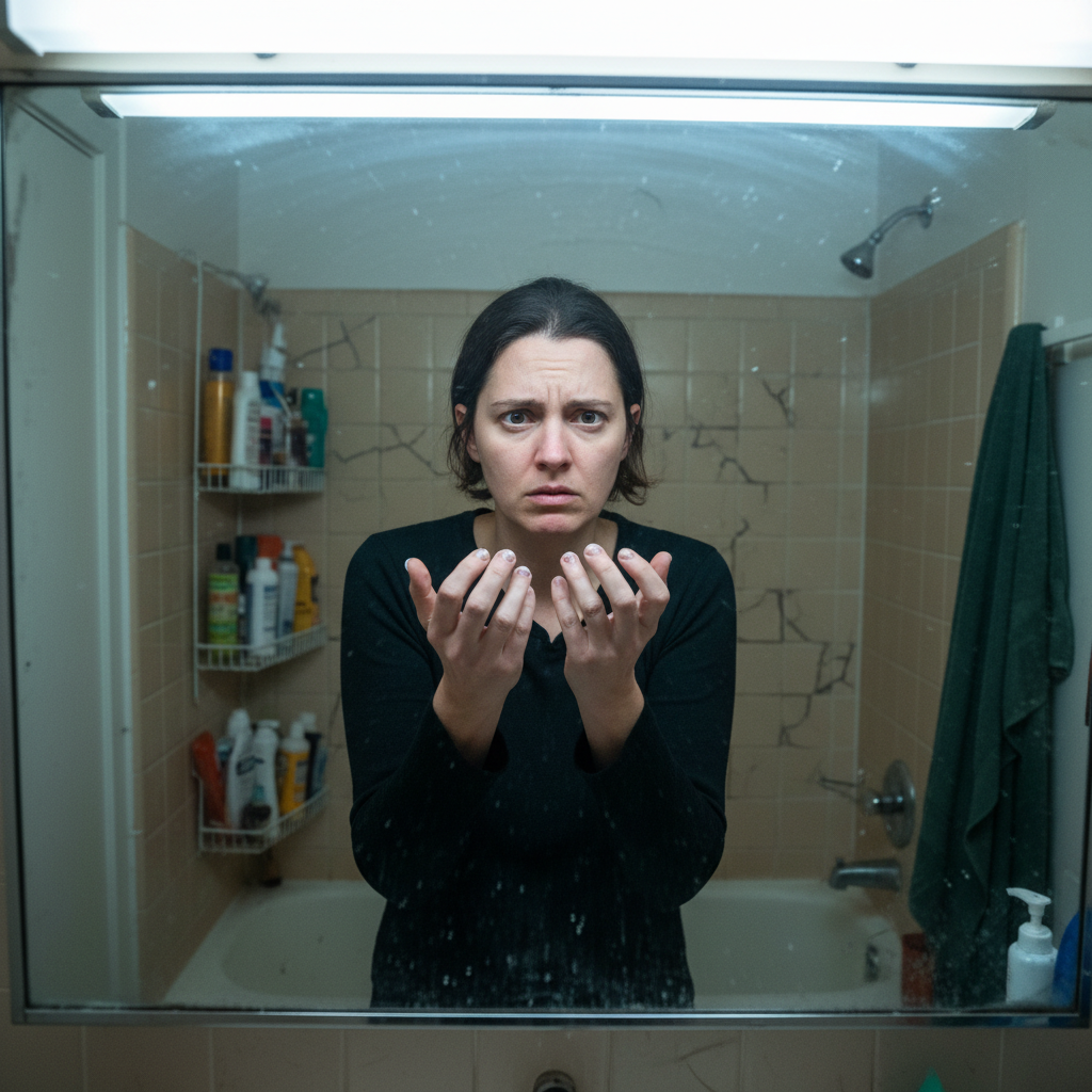 Wieczorne światło słabo filtruje przez okno łazienki, rzucając łagodny blask nad małym, znanym guzem na moim palcu.