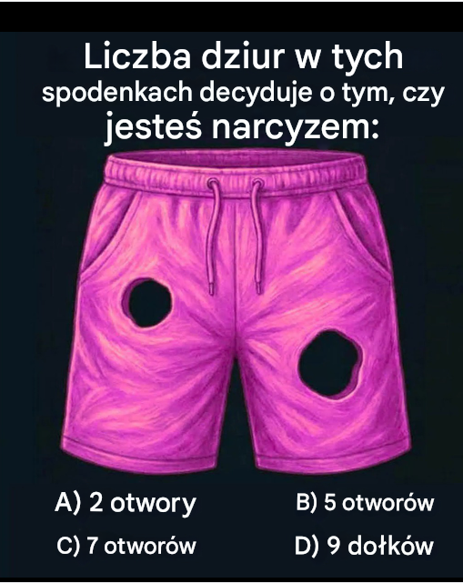 Tekst obrazka: Liczba dziurek w tych spodenkach określa, czy jesteś narcyzem: A) 2 dziurki
