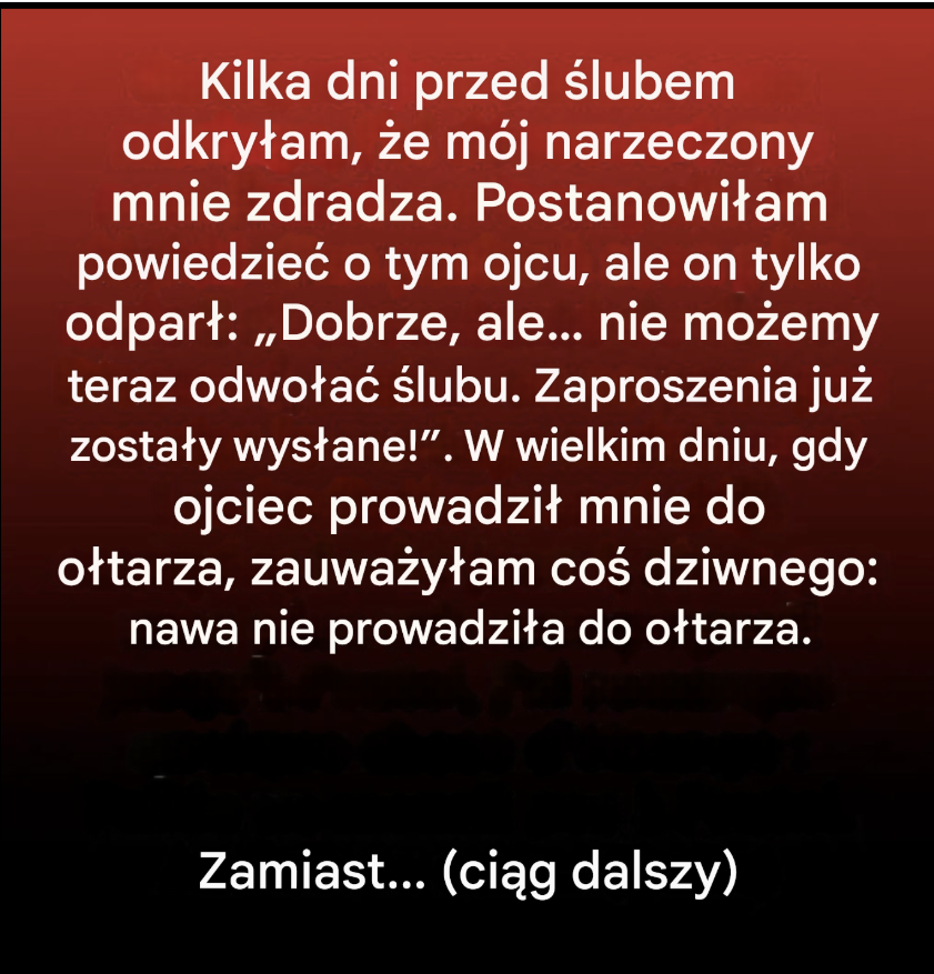 Co jeśli dzień, na który czekałaś miesiącami, nagle stanie się dniem, w którym wszystko się zmieni? Dniem, w którym za uśmiechami i perfekcyjnymi dekoracjami kryje się cicha wątpliwość? Ta historia zaczyna się jak współczesna baśń, ale przenosi nas w zupełnie inne miejsce, gdzie dowiadujemy się, że podążanie za intuicją może być czasem największym darem, jaki możesz sobie podarować.