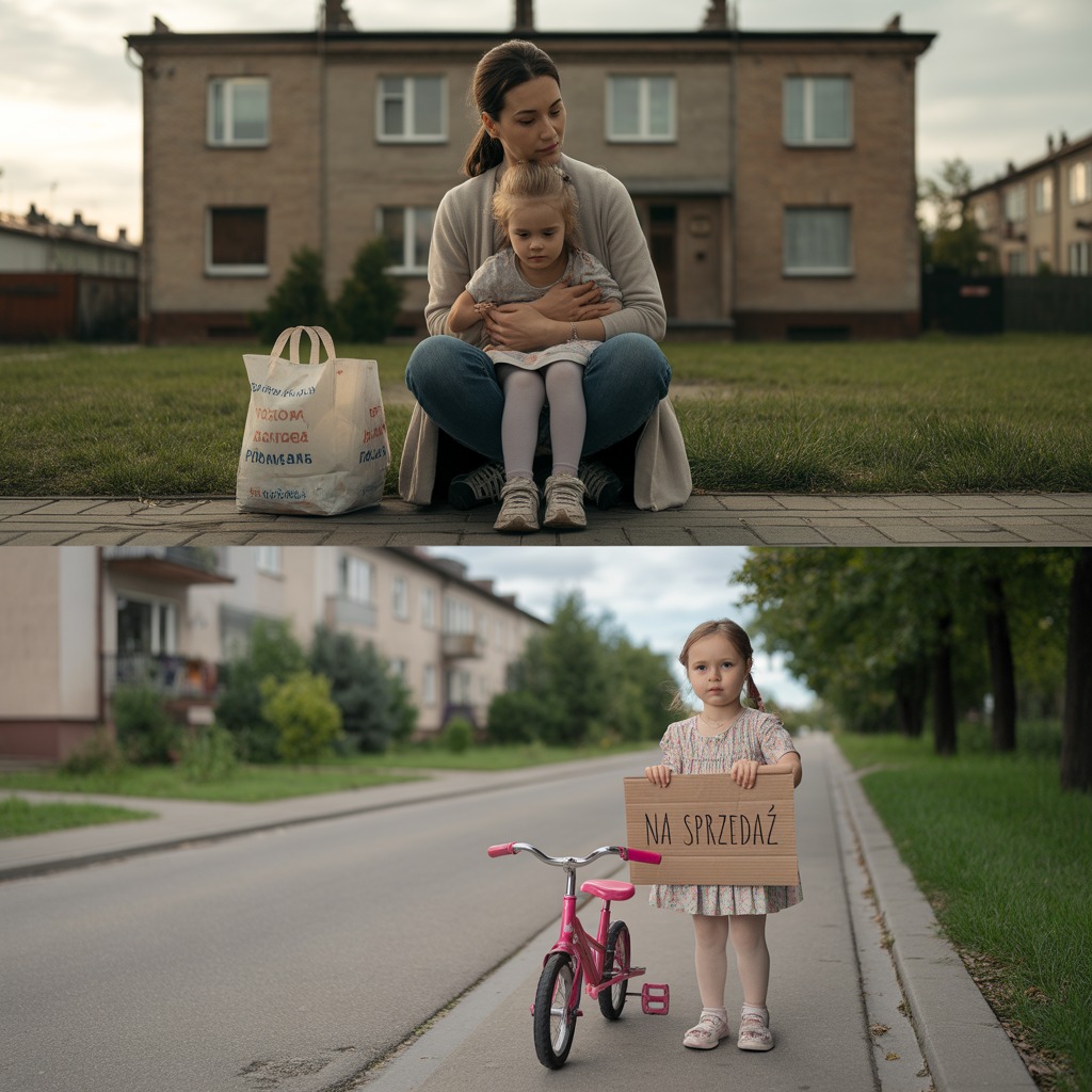 Przy krawężniku stała mała dziewczynka, boso, z rozczochranymi włosami i w sukience pogniecionej od zbyt wielu dni noszenia. Obok niej stał owczarek niemiecki — duży, czujny, z brązowymi oczami utkwionymi w obcych. Dziewczynka trzymała w dłoniach kawałek kartonu, na którym drżącymi, czarnymi literami napisano: „na sprzedaż”.