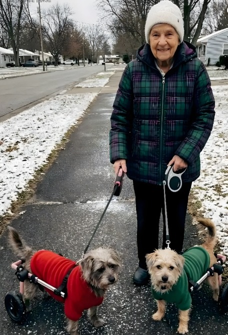 Tak oto Pearl i Buddy, dwa małe psy ze schroniska, trafiły do mojego domu. Ich tylne łapy są ledwo sprawne, więc zamiast biegać jak inne psy, mają zgrabne małe kółka. Nie biegają po podwórku jak inne psy. Toczą się do przodu, a ich wózki cicho stukają po chodniku. I oba merdają ogonami, jakby na świecie panowała tylko radość.