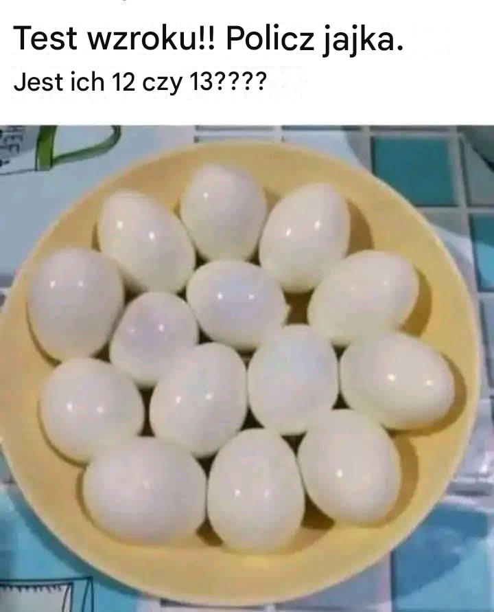 Pytanie „12 czy 13?” to trik psychologiczny. Większość ludzi liczy 12 jajek, które wyraźnie widać na powierzchni. Ponieważ wszystkie jajka mają ten sam kolor i podobne odcienie, wzrok często pomija jajko na dole stosu. Produkty mleczne i jaja